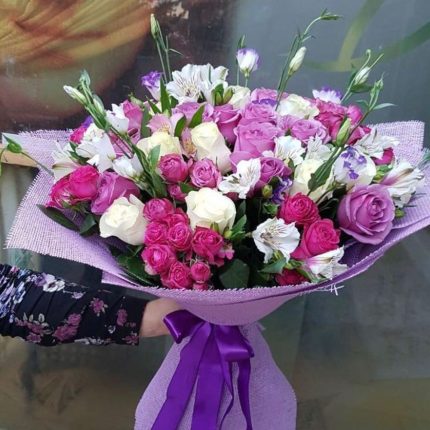Корзина с розами, ирисами, кустовой хризантемой, альстромерией и лимониумом “Виноградная лоза”