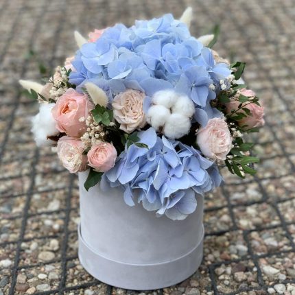 Шляпная коробка гортензией, пионами, эустомой, тюльпанами, гиацинтами, фрезией и гвоздикой “Джоанна”