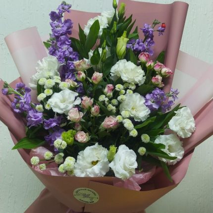 Бархатный цилиндр из голубых диантусов, розовых пионов и ароматной маттиолы