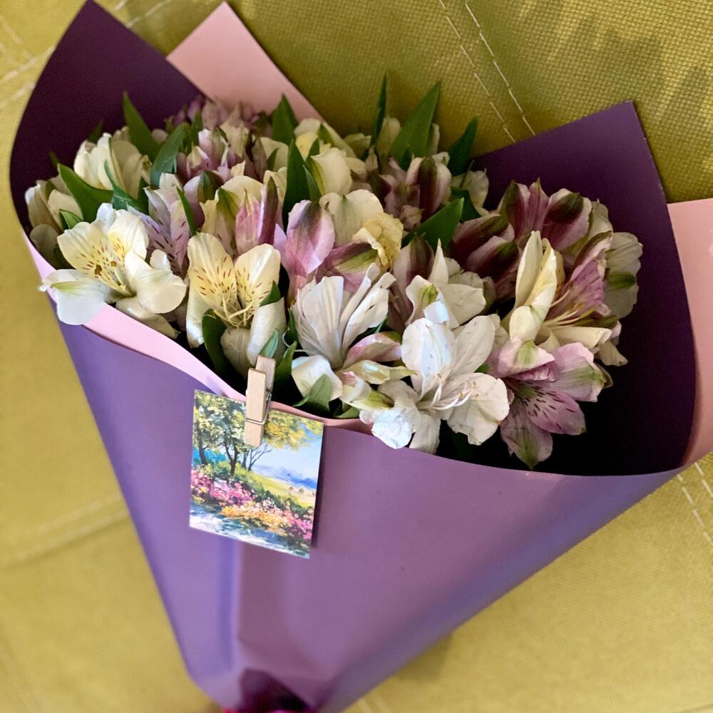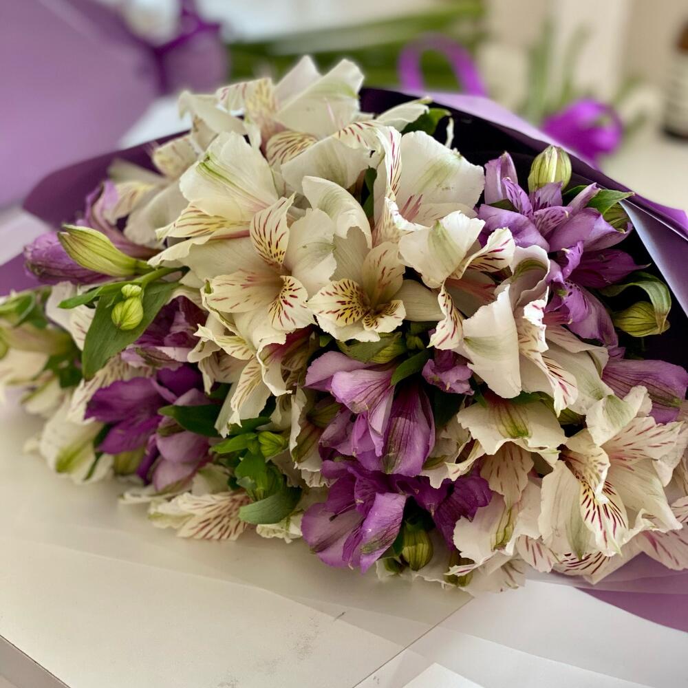 Альстромерия – 15 шт.Лента атласная – 1 шт.Дизайнерская упаковка – 3 шт.