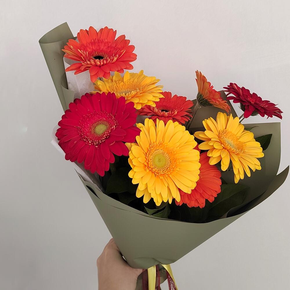 Зелень – 5 шт.Лента атласная – 1 шт.Гербера – 9 шт.Упаковка дизайнерская – 1 шт.