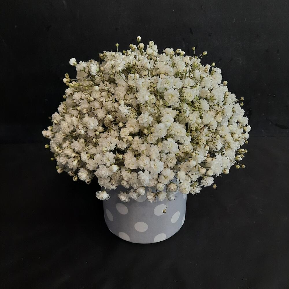 “Сиреневый туман” – композиция из гипсофилы в шляпной коробке