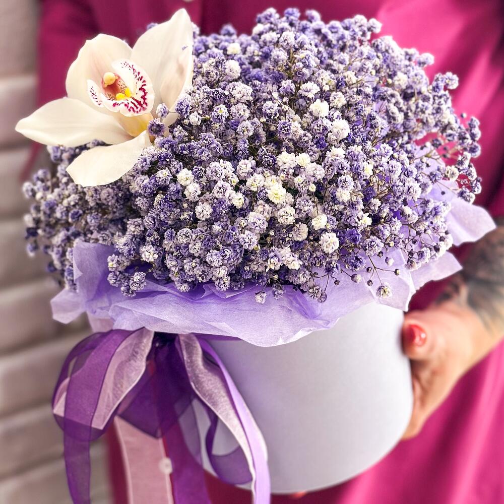 Играющая, сиреневая гипсофила с долгоиграющей Орхидеей собрана в одну стильную шляпную коробку!Благодаря пышности этих цветов,букет смотрится словно воздушный закат уходящий вдаль!Яркий и необычный комплимент для любого повода!Добавляйте товар и магазин в избранное,чтобы было легче нас найти