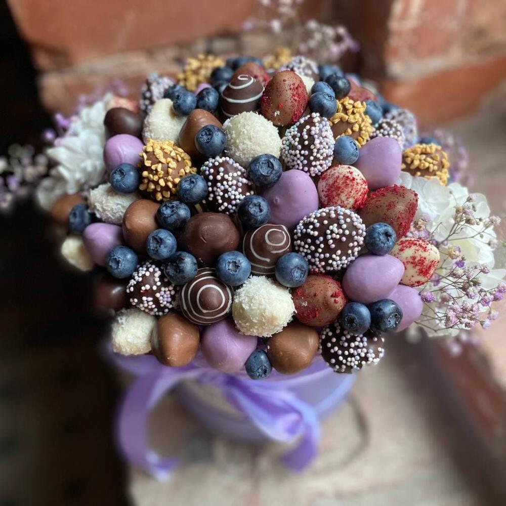 Коробка с клубникой в шоколаде, голубикой и цветами “Черничный бархат”