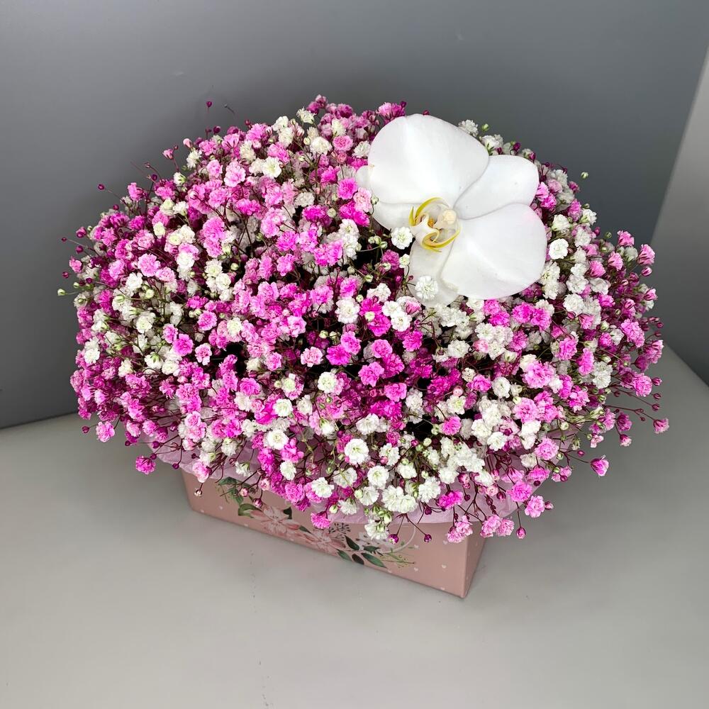 гипсофила радужная – 6 шт.орхидея фаленопсис цветок – 1 шт.Коробка – 1 шт.Тишью – 2 шт.Оазис флористический – 1 шт.Пленка прозрачная – 1 шт.Лента атласная – 2 шт.