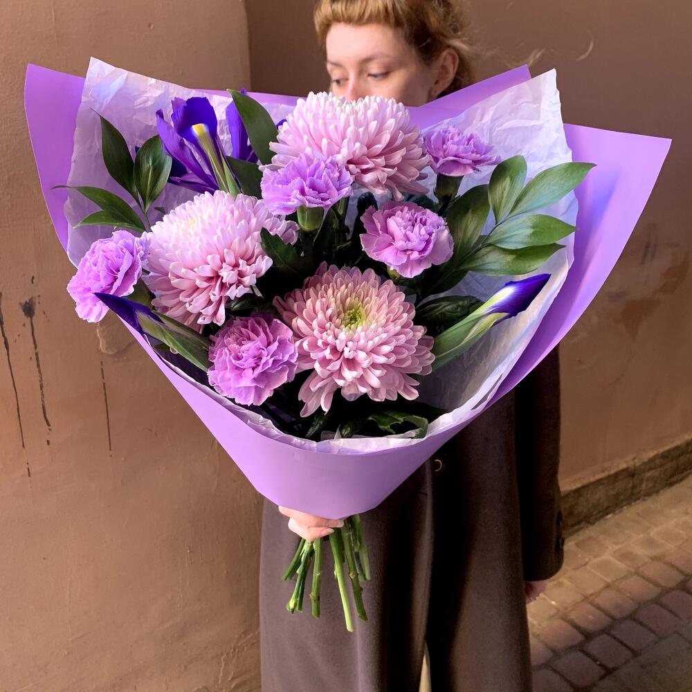 Авторский букет для ARMY “I purple you” с лунной гвоздикой, ирисом и хризантемой