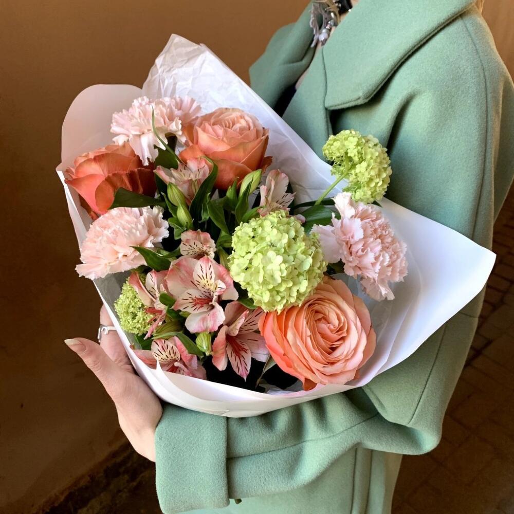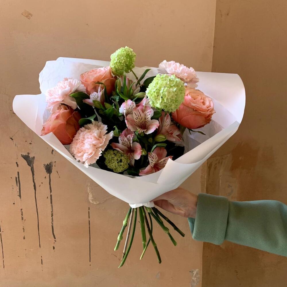 Альстромерия – 2 шт.Вибурнум – 1 шт.Гвоздика розовая – 2 шт.Рускус сочи – 2 шт.Роза кахала – 3 шт.Авторская упаковка – 1 шт.