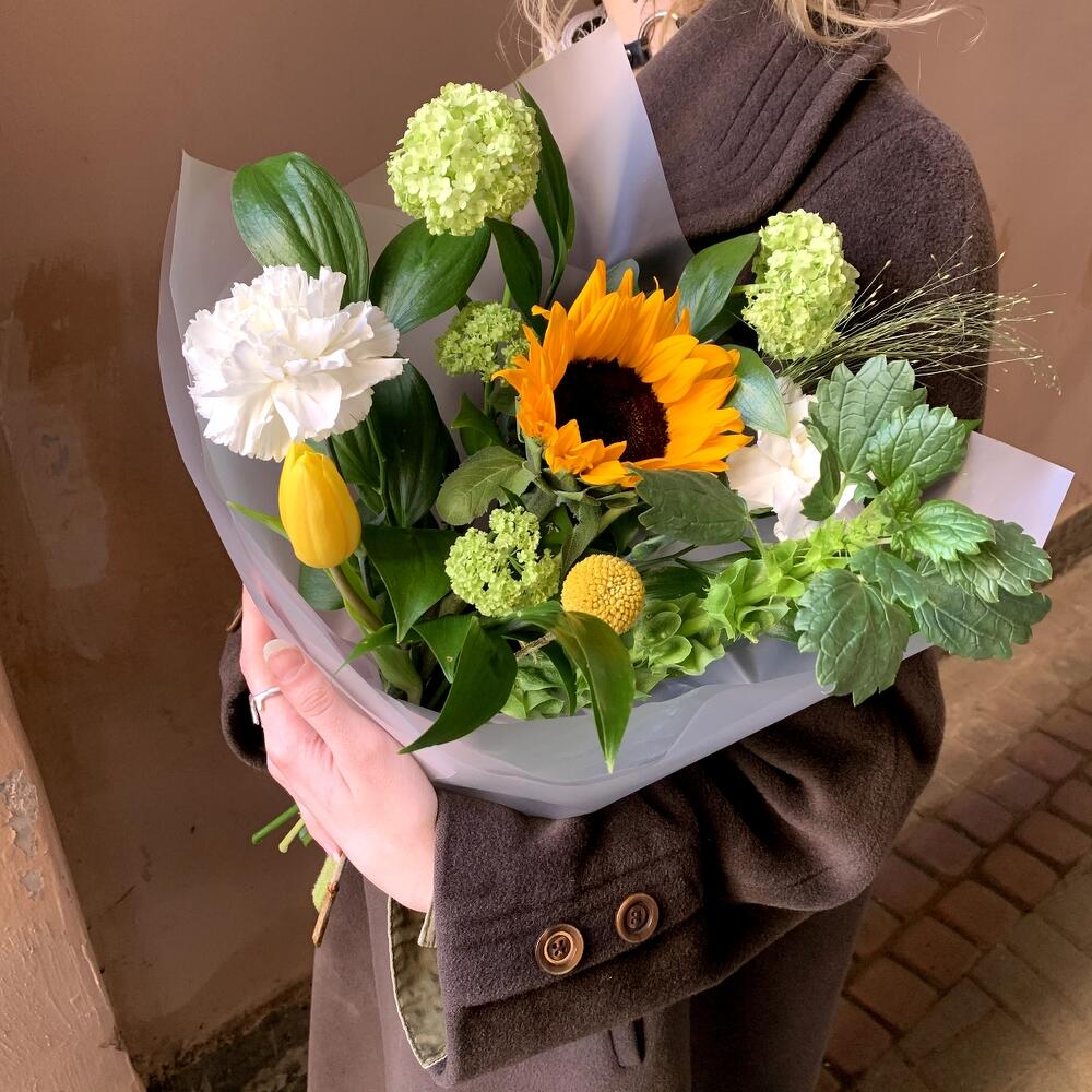 Вибурнум – 1 шт.Краспедия – 1 шт.Паникум – 1 шт.Подсолнух – 1 шт.Гвоздика белая – 2 шт.Тюльпан желтый – 1 шт.Рускус сочи – 5 шт.Молюцелла – 1 шт.Авторская упаковка – 1 шт.
