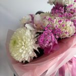 Букет с пионами и хризантемой в дизайнерском оформлении