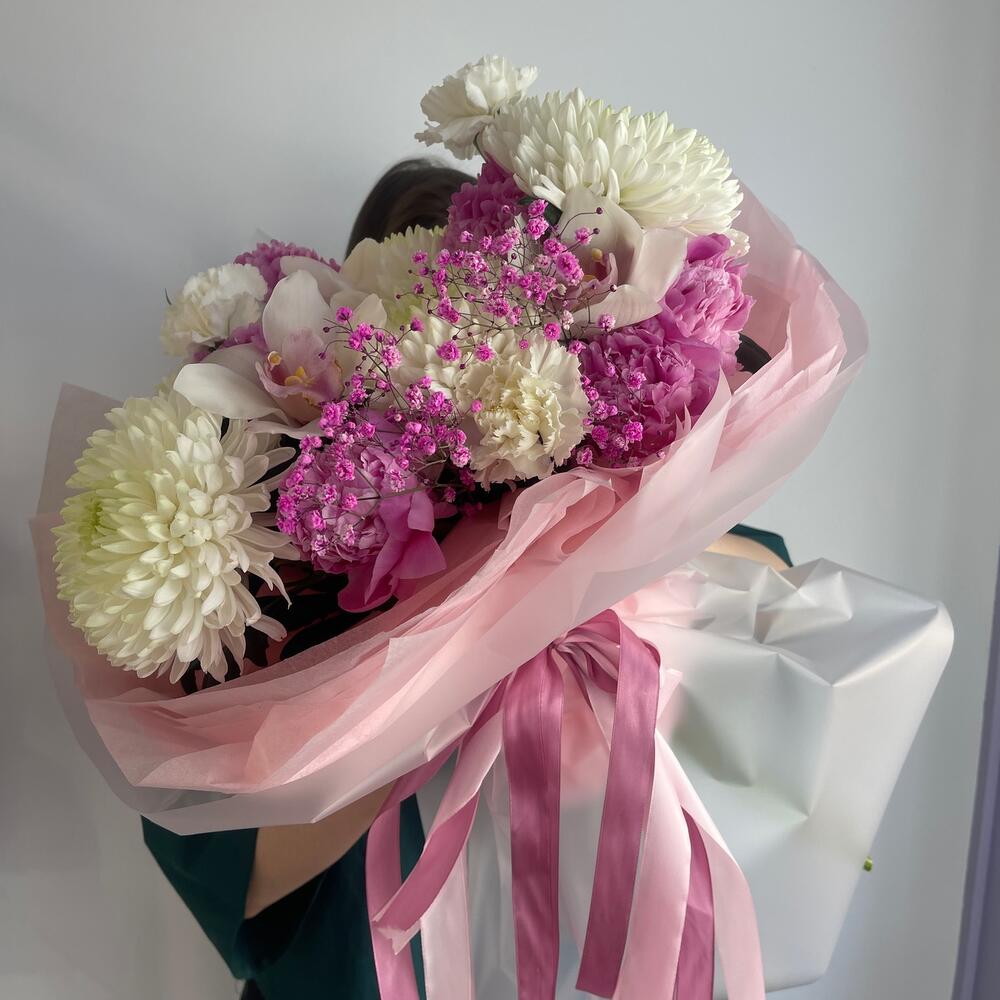 Букет из пионов, хризантем и орхидей