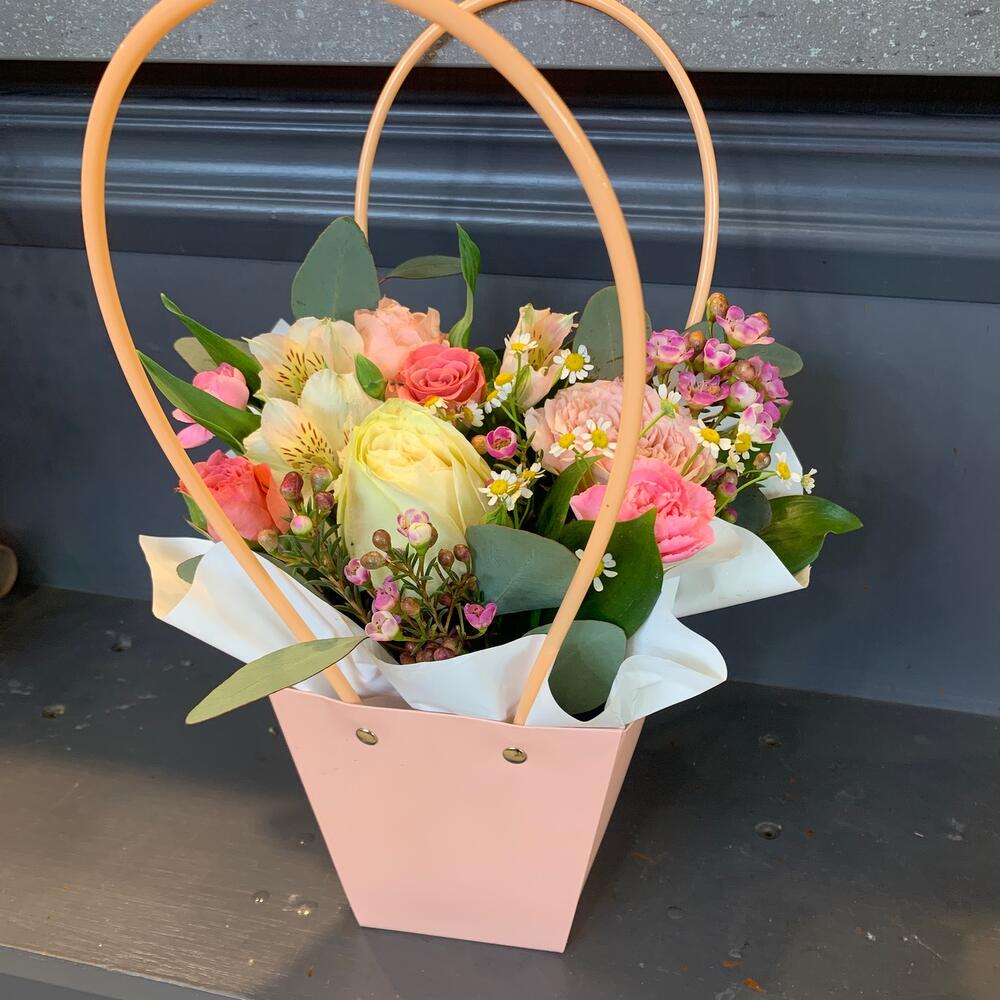 Красивая композиция в элегантной сумочке, в нежной цветовой, поднимет настроение и порадует легкостью в уходе за срезанными цветами, т.к не требуется ваза и смена воды для цветовЦветы находятся в специальной флористической губке с антибактериальным свойством , для поддержания свежести цветов доливайте немного чистой воды в губку 1 раз в 2-3 дня и наслаждайтесь красотой цветов.Цветовая гамма и состав цветов может меняться, оставаясь в том же цветовом решении.