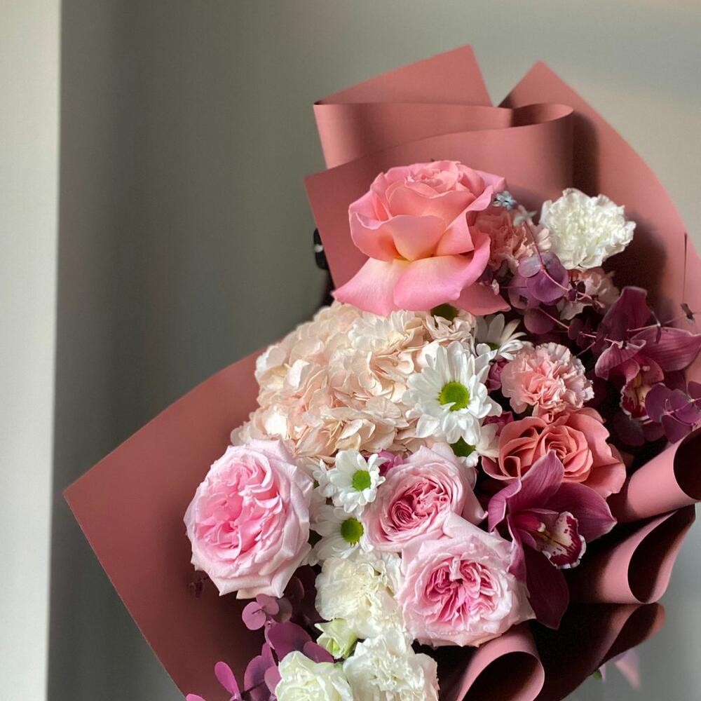 розы – 5 шт. Лизиантус – 2 шт. Гвоздика – 3 шт. Хризантема – 2 шт. Гортензия – 1 шт. Спрей – 2 шт. орхидея – 2 шт. Эвкалипт – 2 шт.