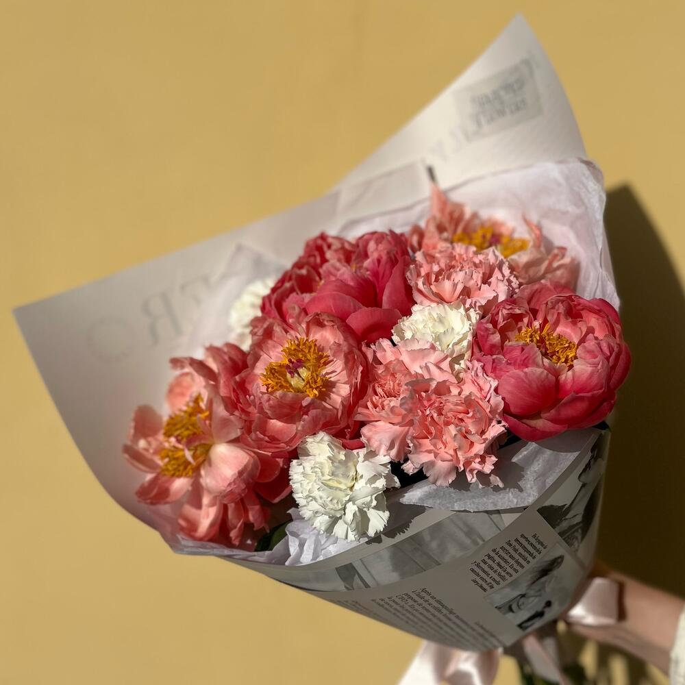 Гвоздика – 6 шт.Пион коралл шарм – 5 шт.Дизайнерская упаковка – 1 шт.