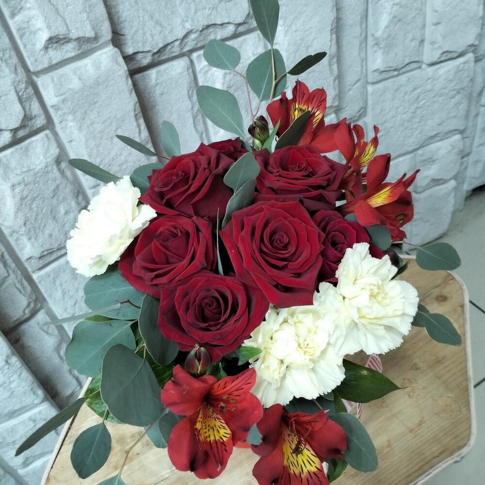 Роза Эквадор – 5 шт.Лента атласная – 1 шт.Гвоздика сортовая – 3 шт.Конус – 1 шт.Альстромерия Микс Европа – 1 шт.Эвкалипт Микс – 3 шт.