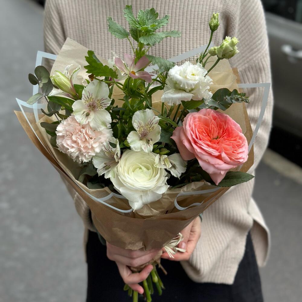 Сборный букет с ранункулюсами и пионовидной розой