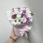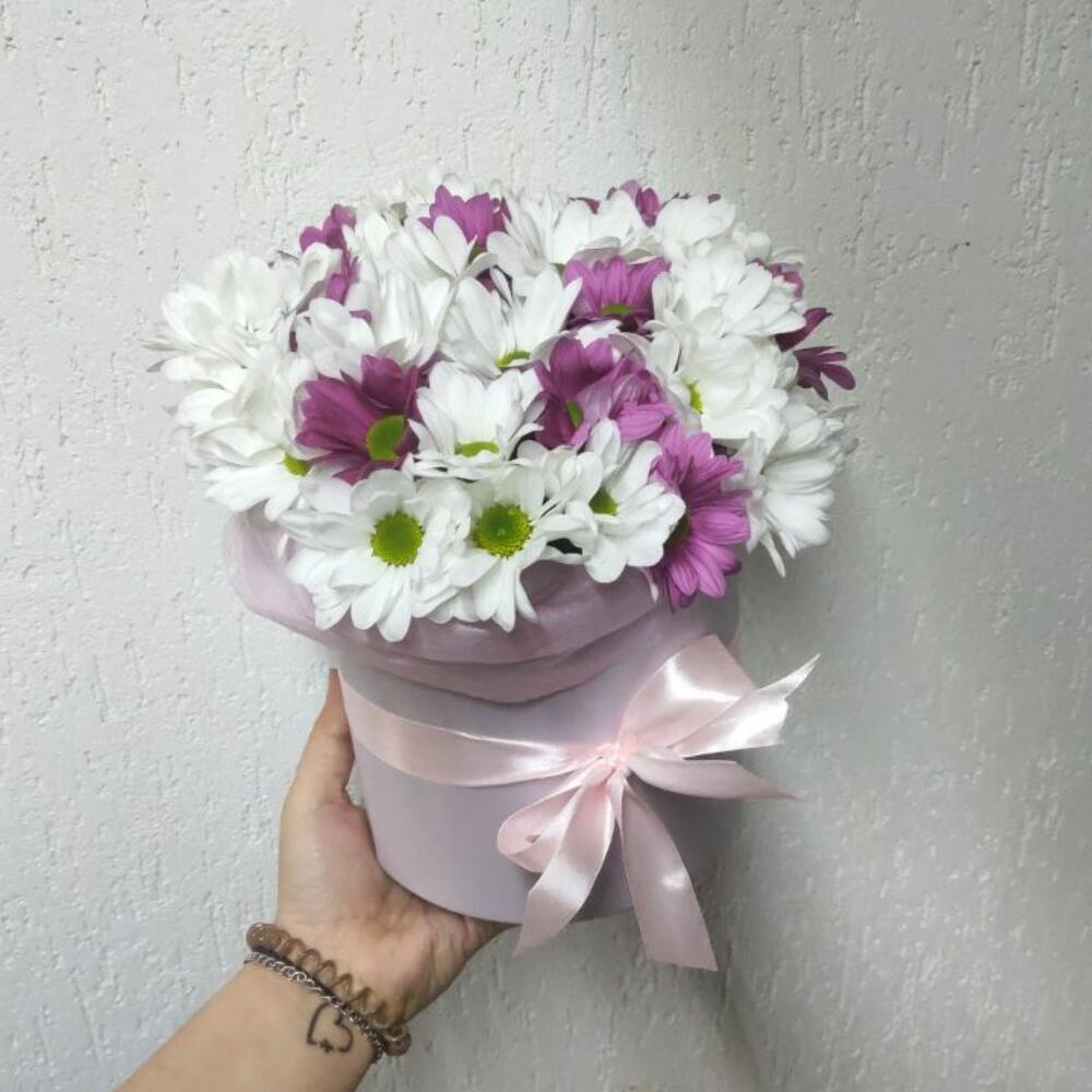 Хризантема кустовая розовая – 2 шт.Хризантема кустовая белая – 3 шт.Шляпная коробка – 1 шт.Лента атласная – 1 шт.Оазис – 1 шт.