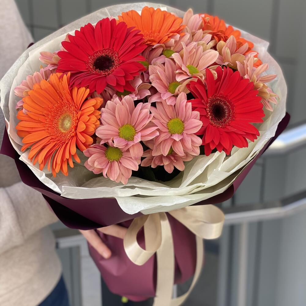 Хризантема – 4 шт. Гербера – 5 шт. Оформление – 1 шт.