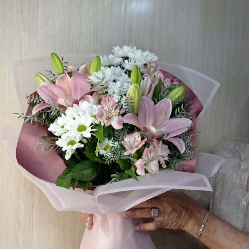 Лилия розовая – 2 шт. Хризантема кустовая ромашковая – 3 шт. Альстромерия Микс Европа – 4 шт.