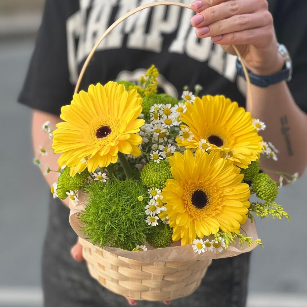 Солидаго – 2 шт.Гербера – 3 шт.Матрикария – 3 шт.Крафт – 1 шт.Хризантема зеленая – 4 шт.Корзина плетеная – 1 шт.Оазис флористический – 1 шт.