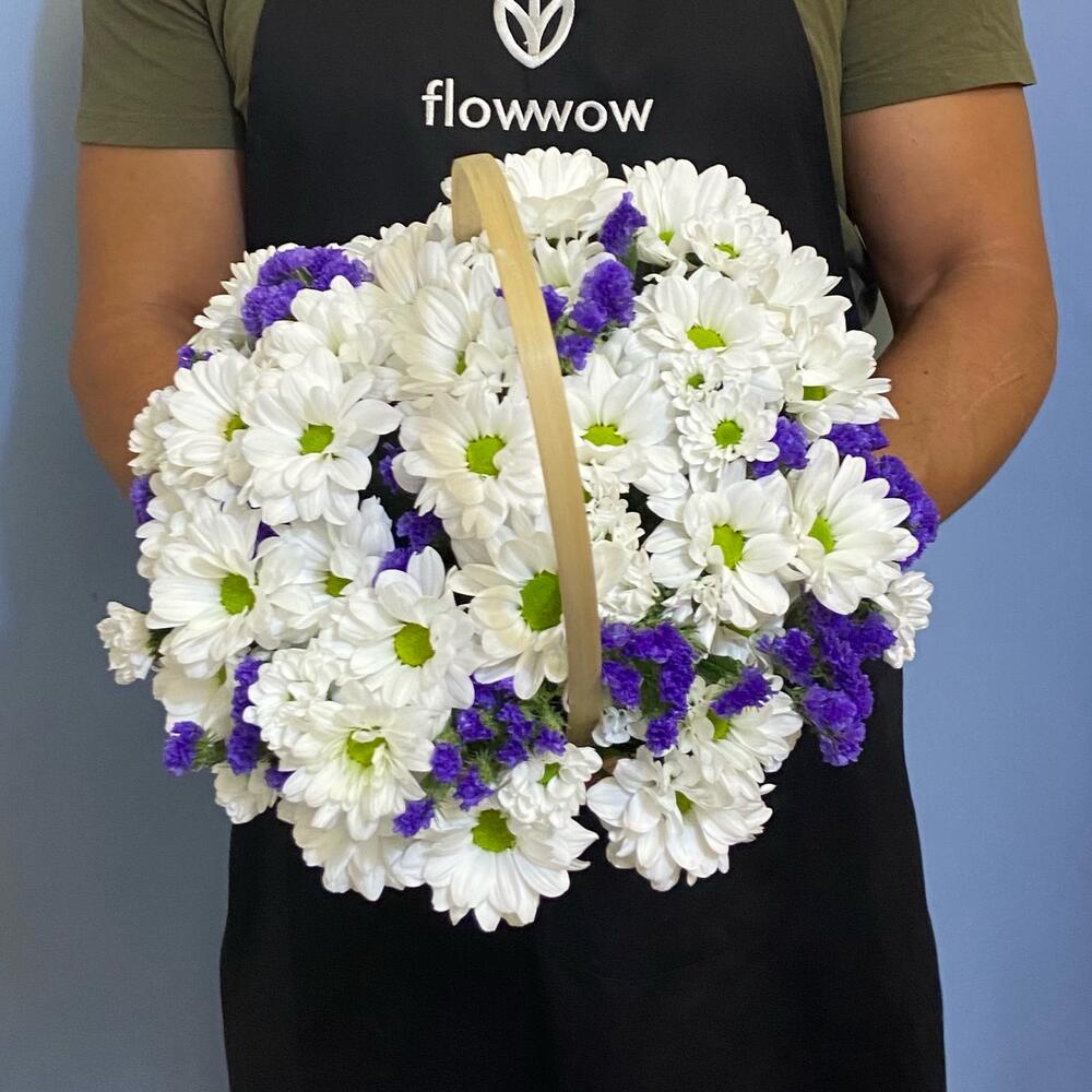 Кустовая ромашковая хризантема – 5 шт.Синяя статица – 2 шт.Корзина – 1 шт.