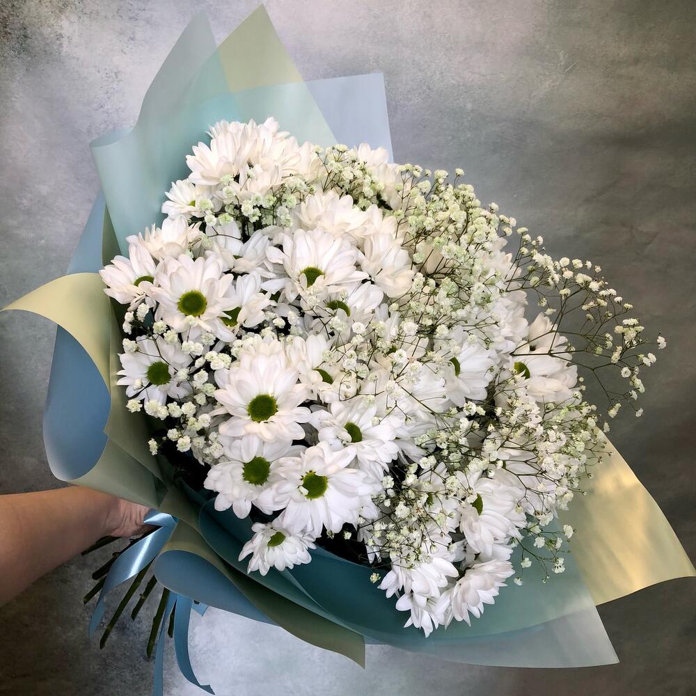 Хризантема кустовая – 13 шт.Гипсофила – 5 шт.Упаковка дизайнерская – 2 шт.
