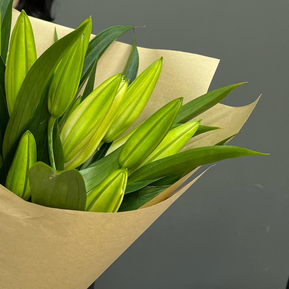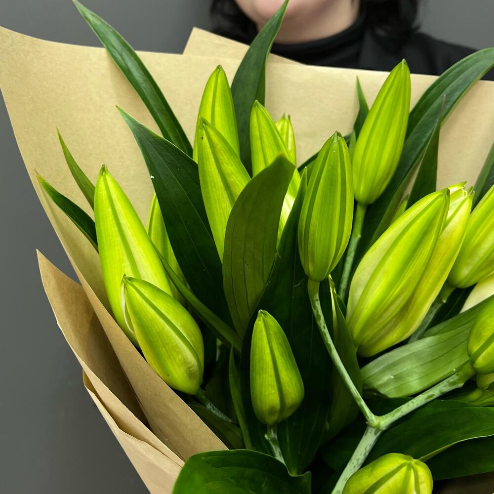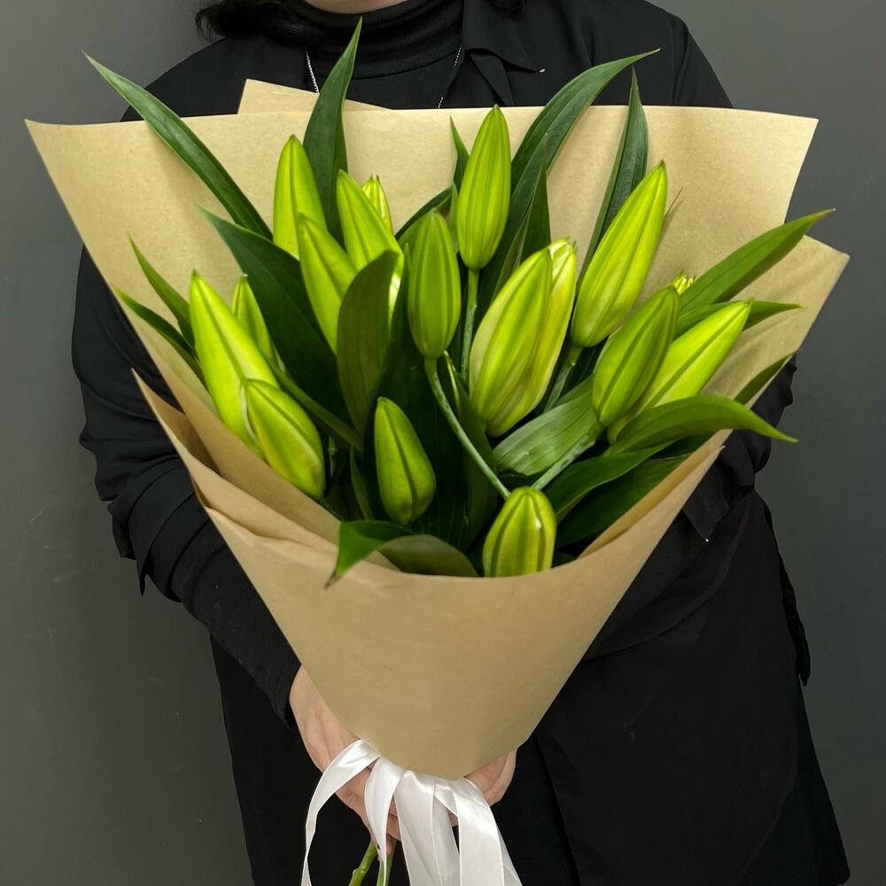 Лента атласная – 1 шт.Лилия белая – 5 шт.крафт натуральный – 1 шт.