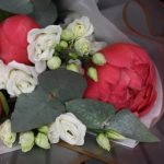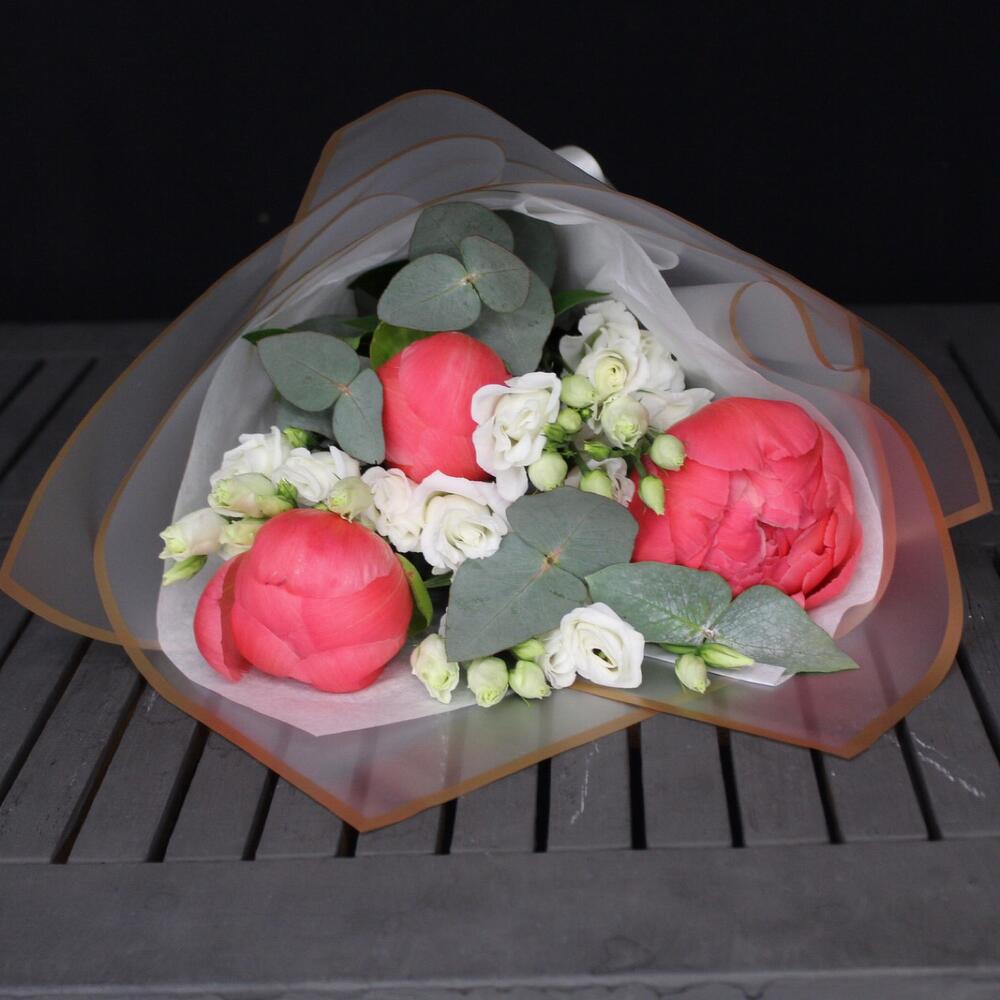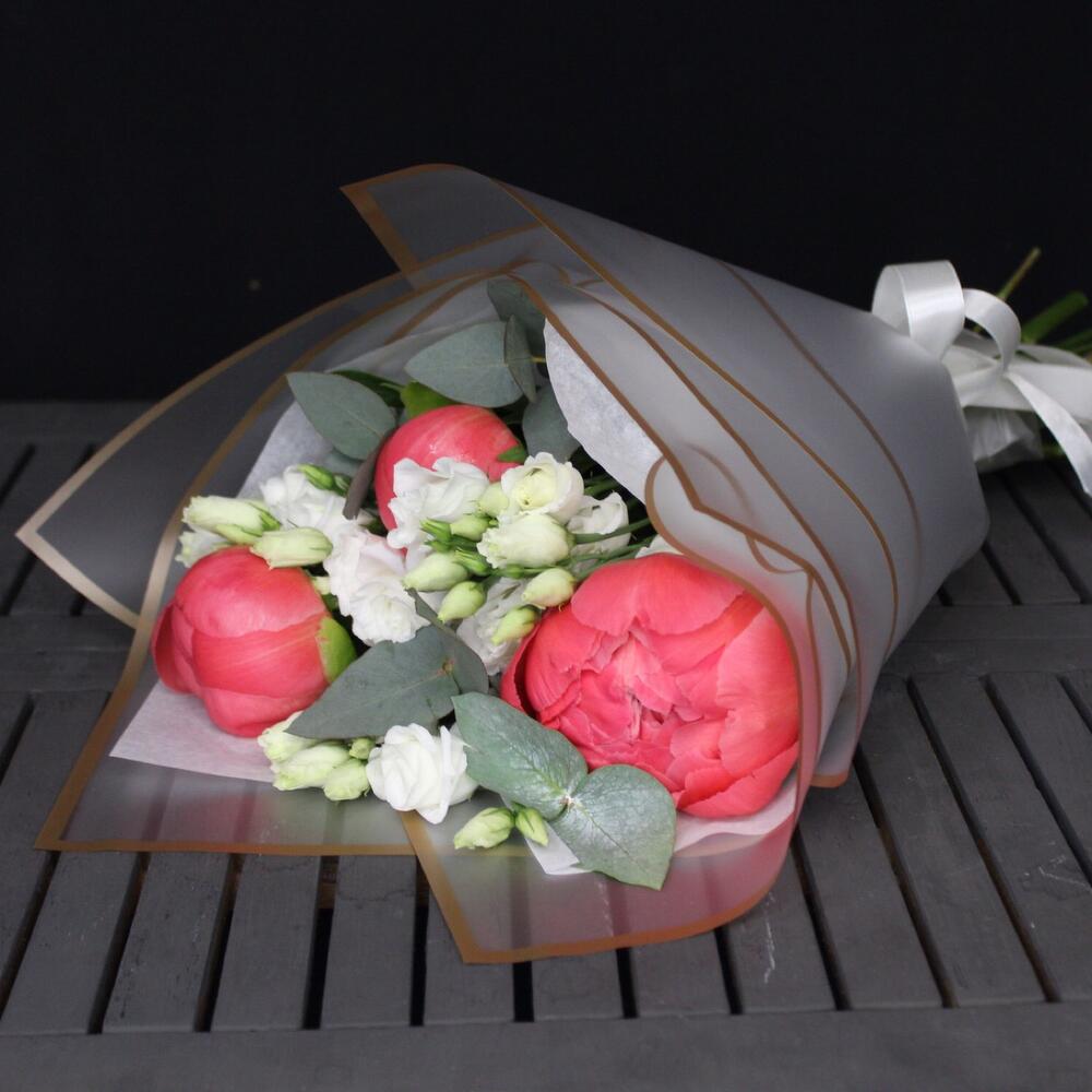 Эвкалипт – 2 шт.Пленка матовая – 2 шт.Тишью белое – 1 шт.Пион коралл шарм – 3 шт.эустома розита вайт – 3 шт.