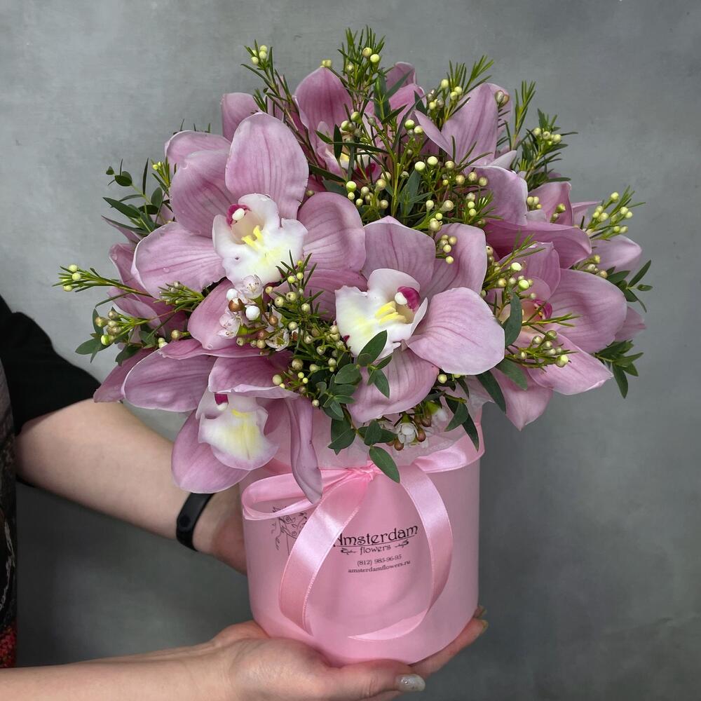 Коробка d15 – 1 шт.Оазис флористический – 1 шт.Орхидея Цимбидиум – 15 шт.Ваксфлауэр – 3 шт.Эвкалипт – 2 шт.