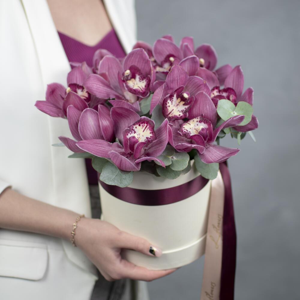 орхидея cymbidium – 11 шт.эвкалипт cinerea – 5 шт.Коробка шляпная – 1 шт.