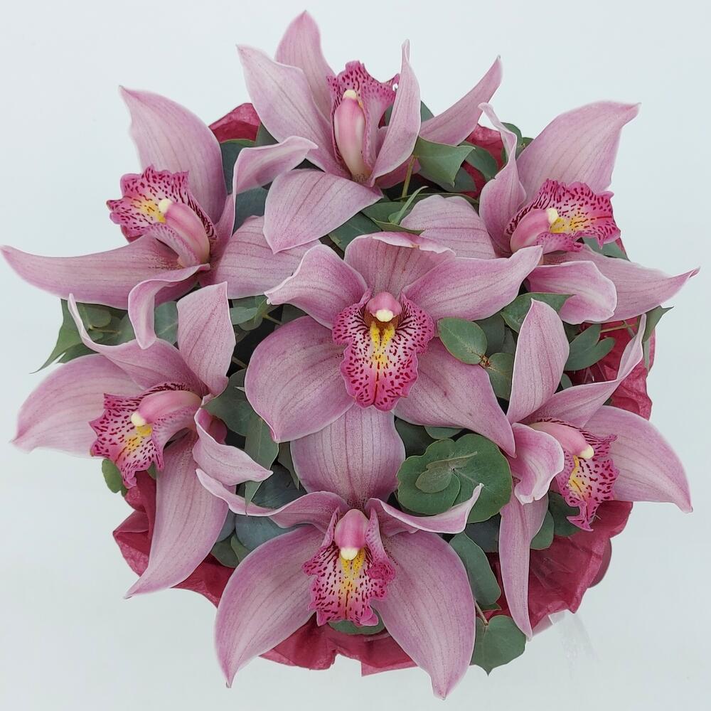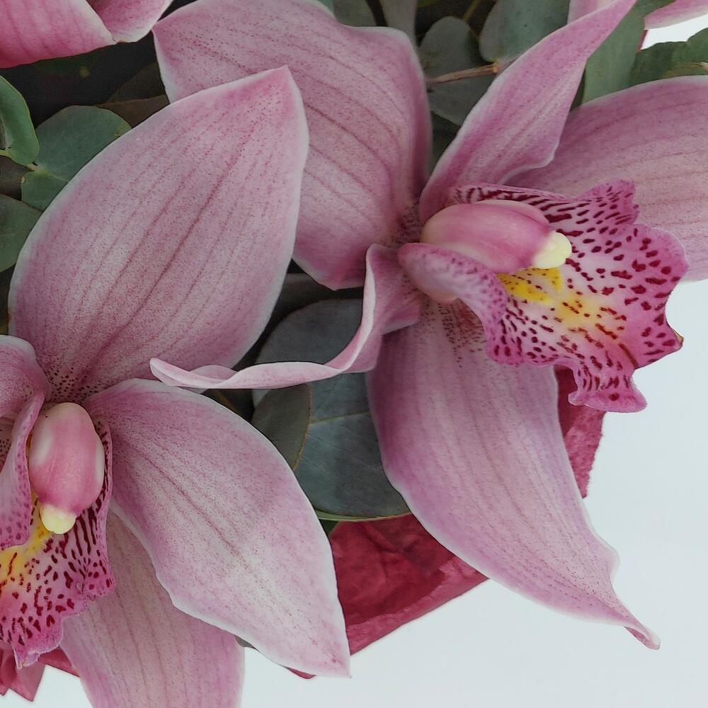Темно-розовый Цимбидиум с эвкалитом в коробке