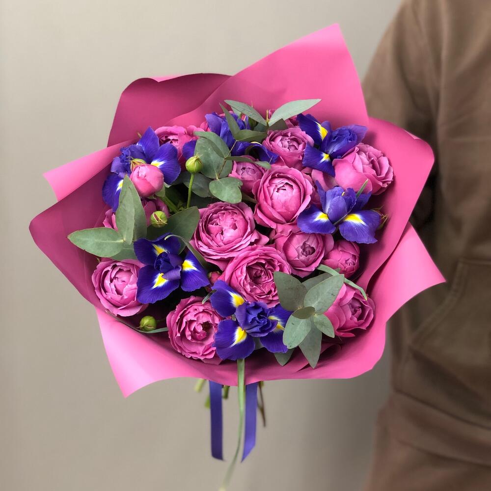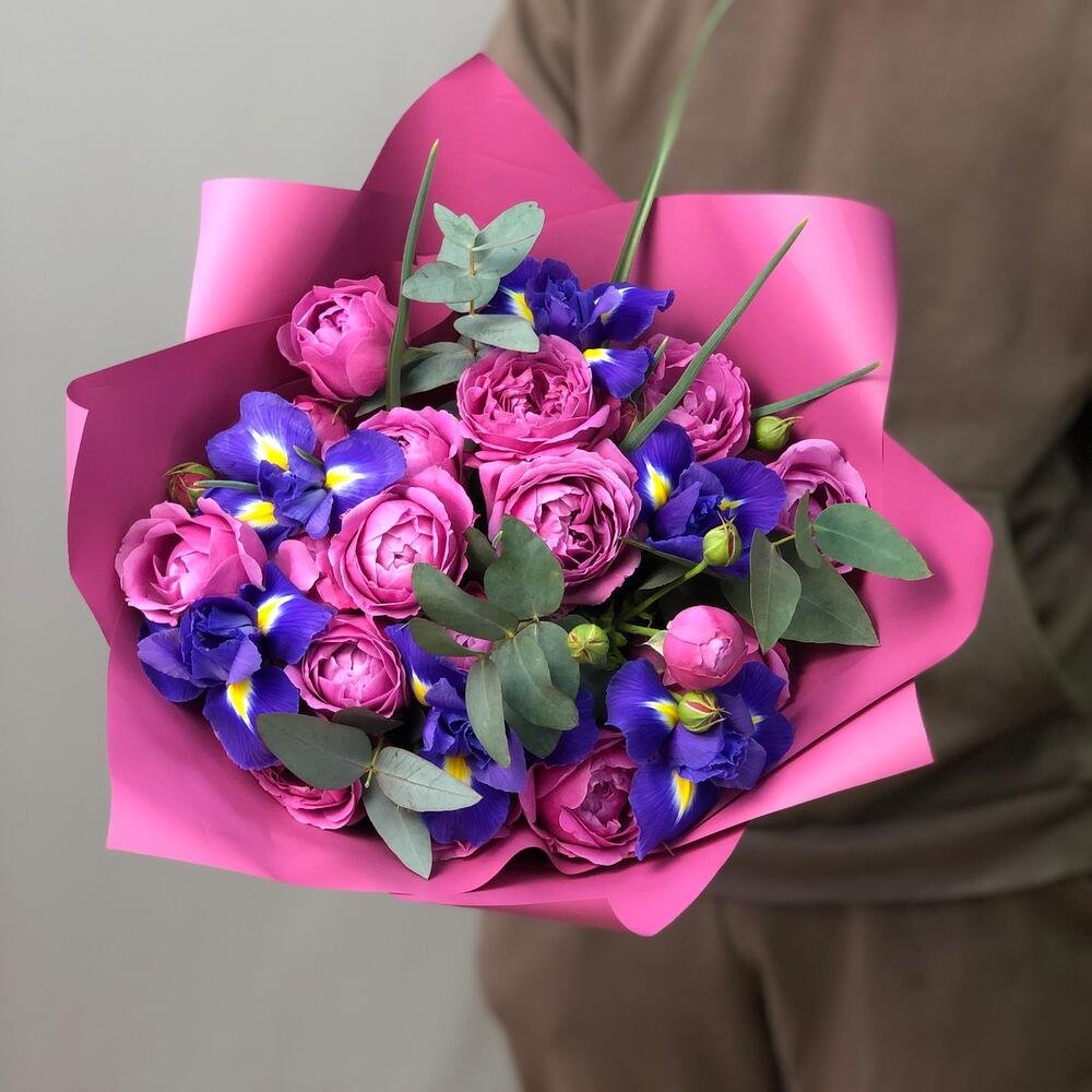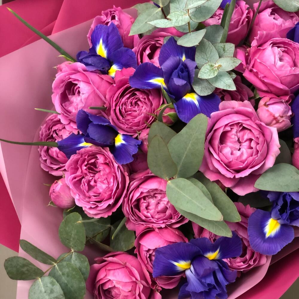 Зелень – 4 шт.Ирис синий – 6 шт.розы пионовидные кустовые – 5 шт.оформление корейская пленка – 1 шт.