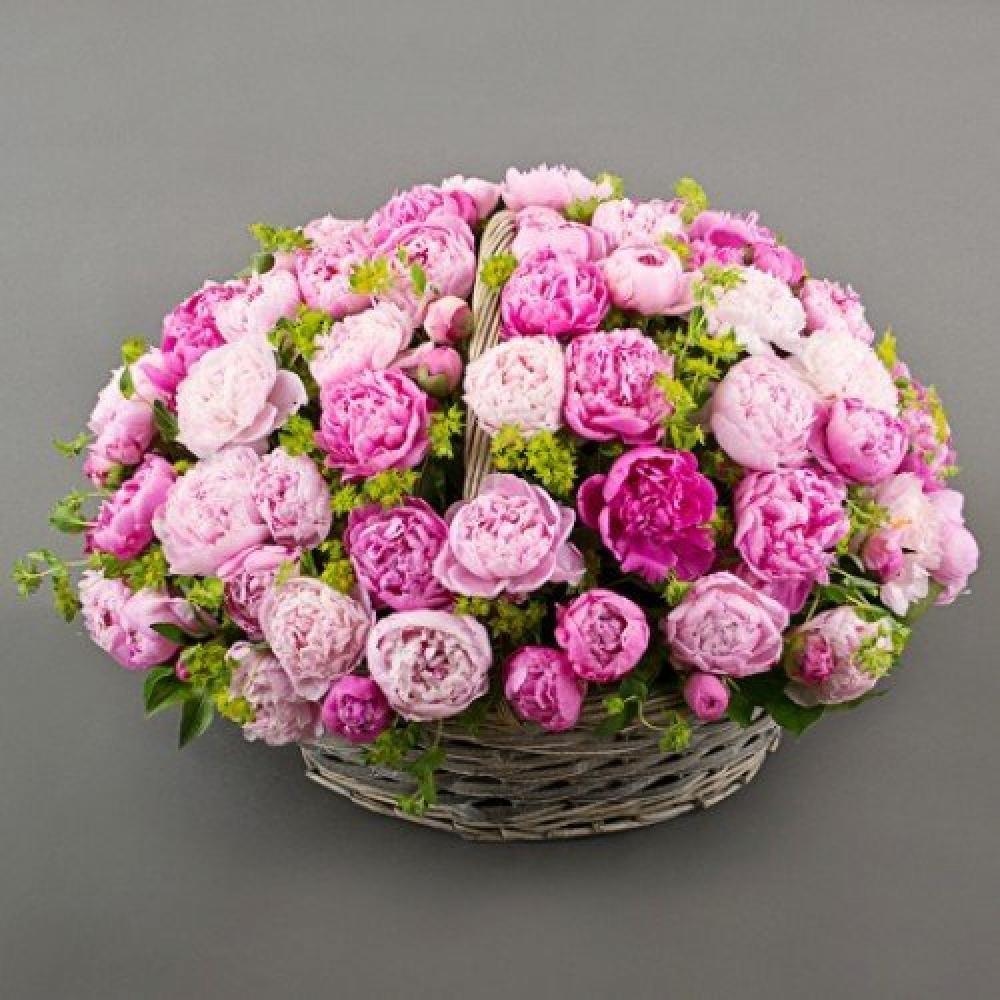Пион – 101 шт.Корзина плетеная – 1 шт.Оазис флористический – 10 шт.зелень декоративная – 50 шт.