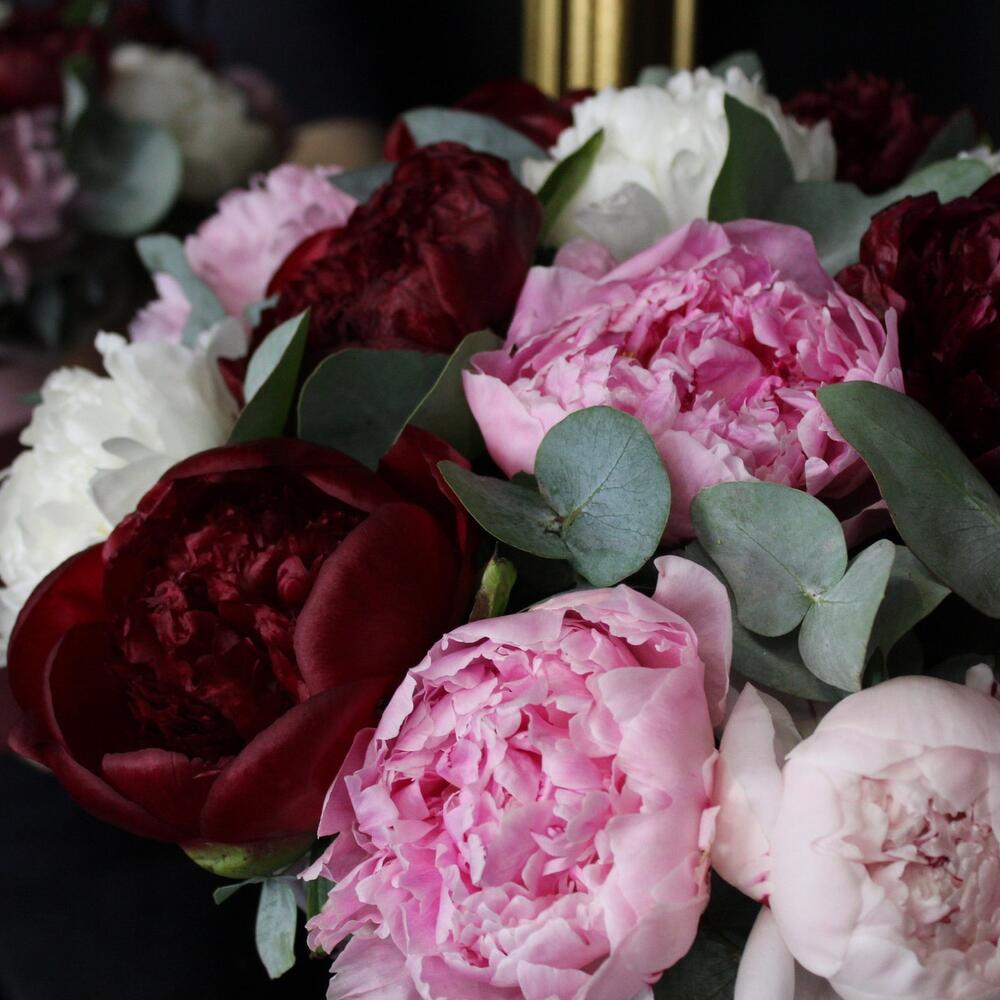 Пион Сара Бернар – 5 шт.Пион Ред Шарм – 6 шт.Пион белый – 4 шт.Оазис флористический – 1 шт.Шляпная коробка – 1 шт.Лента атласная – 2 шт.Эвкалипт Baby Blue – 5 шт.