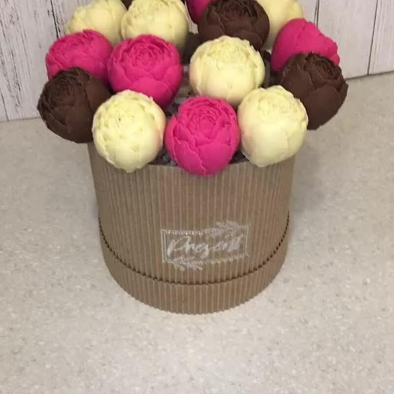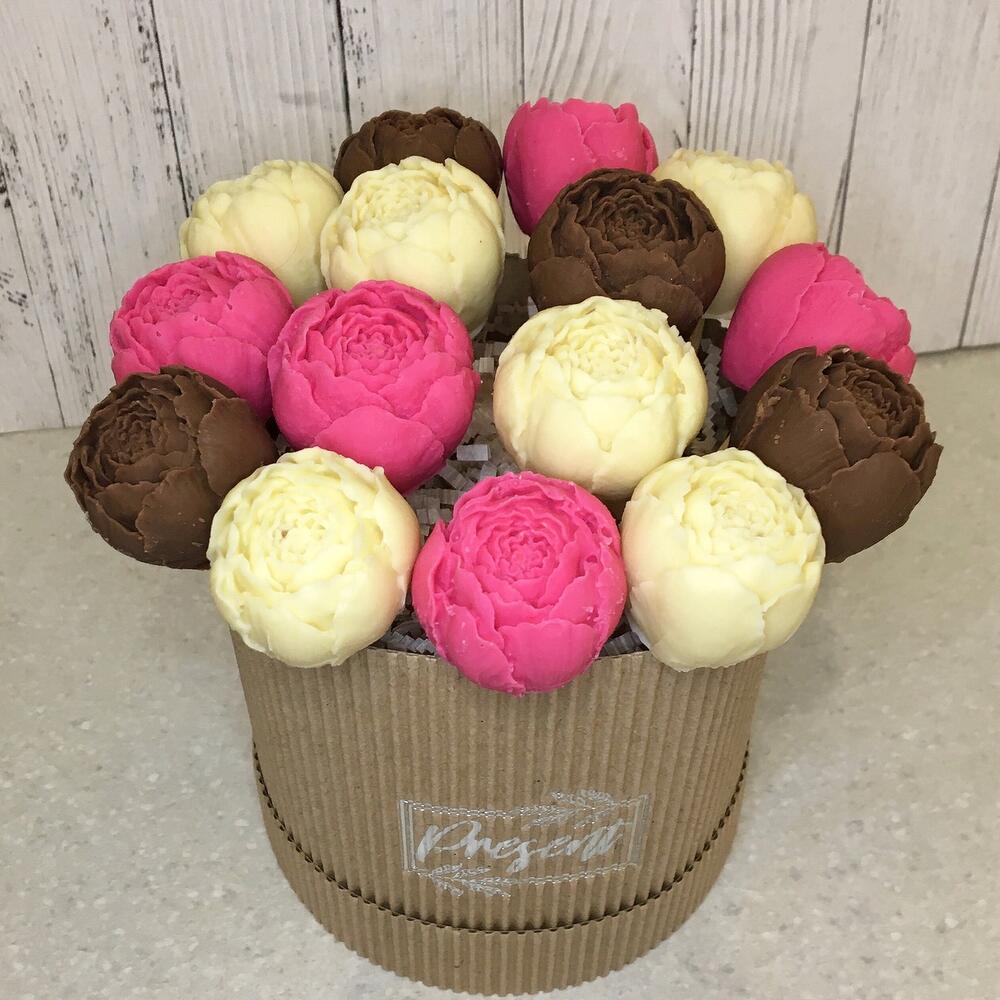 Упаковка – 1 шт.Шляпная коробка – 1 шт.Атласная лента – 1 шт.Шпажки – 15 шт.пионы из бельгийского белого шоколада – 11 шт.пионы из бельгийского молочного шоколада – 4 шт.