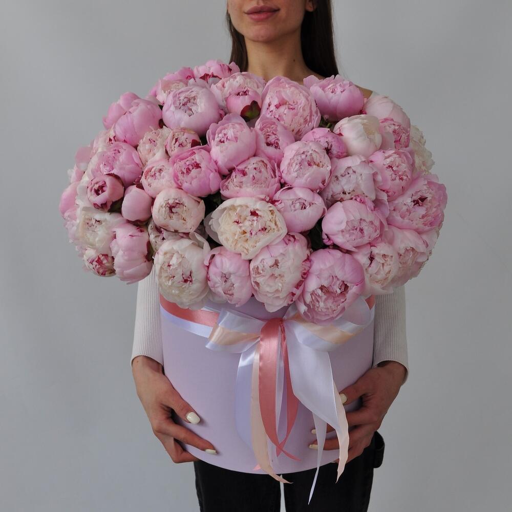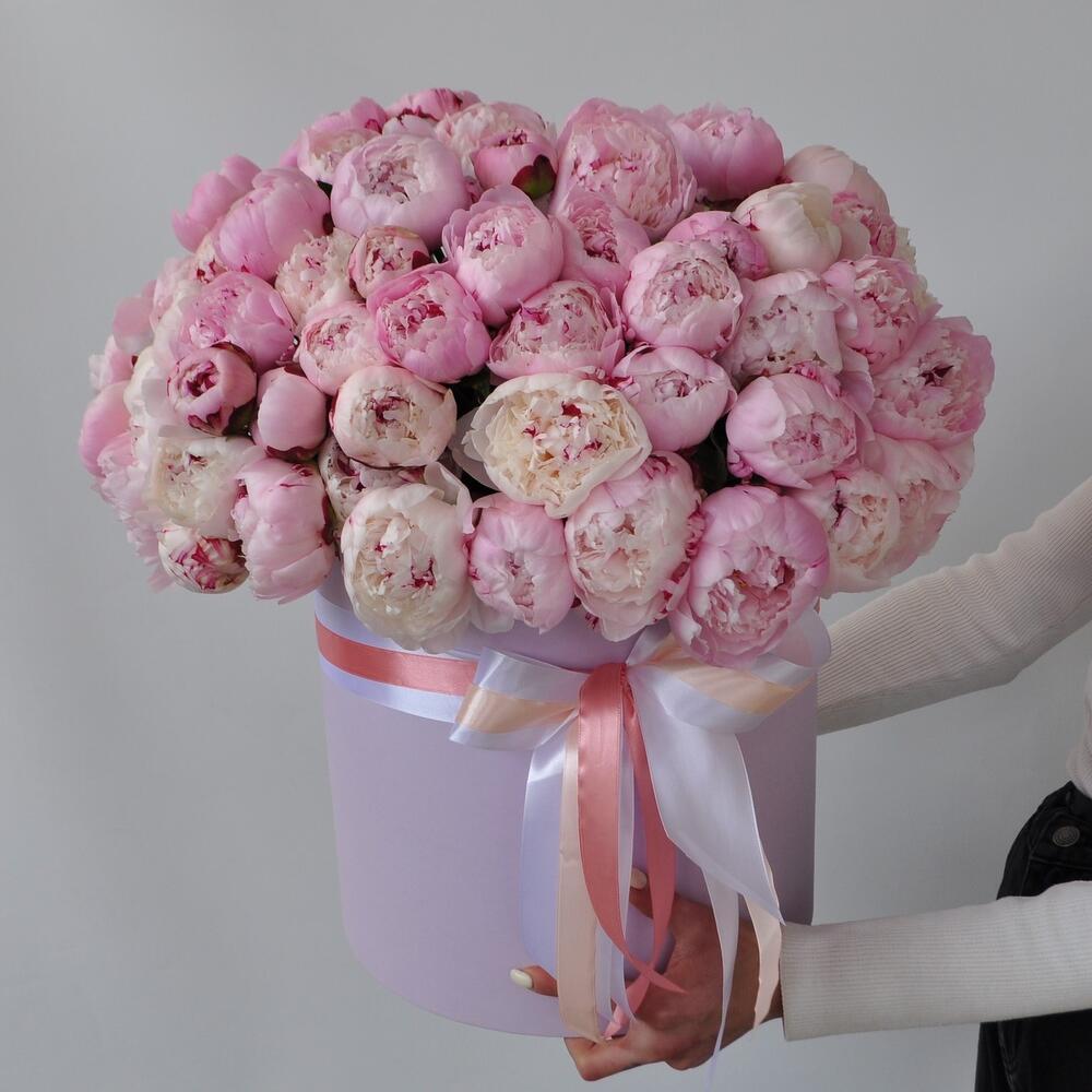 Лента атласная – 1 шт.Коробка шляпная – 1 шт.Пион Сара Бернар – 65 шт.Оазис флористический – 3 шт.