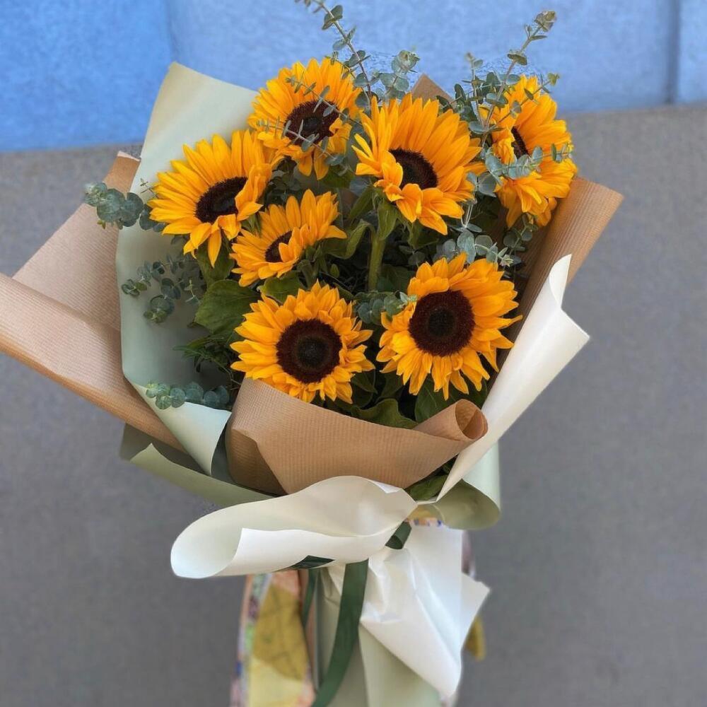 Авторский букет из 7 подсолнухов с эвкалиптом