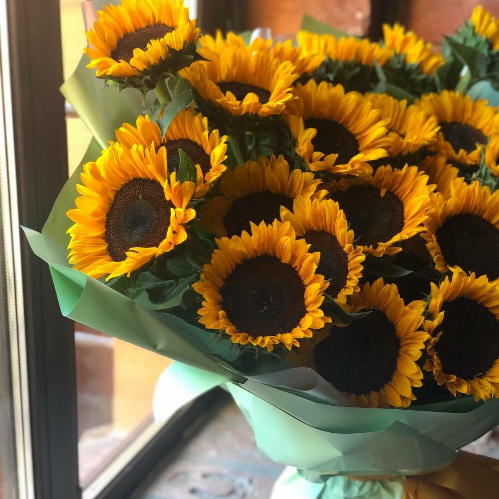 Букет из 27 подсолнухов в стильной упаковке “Энигма”