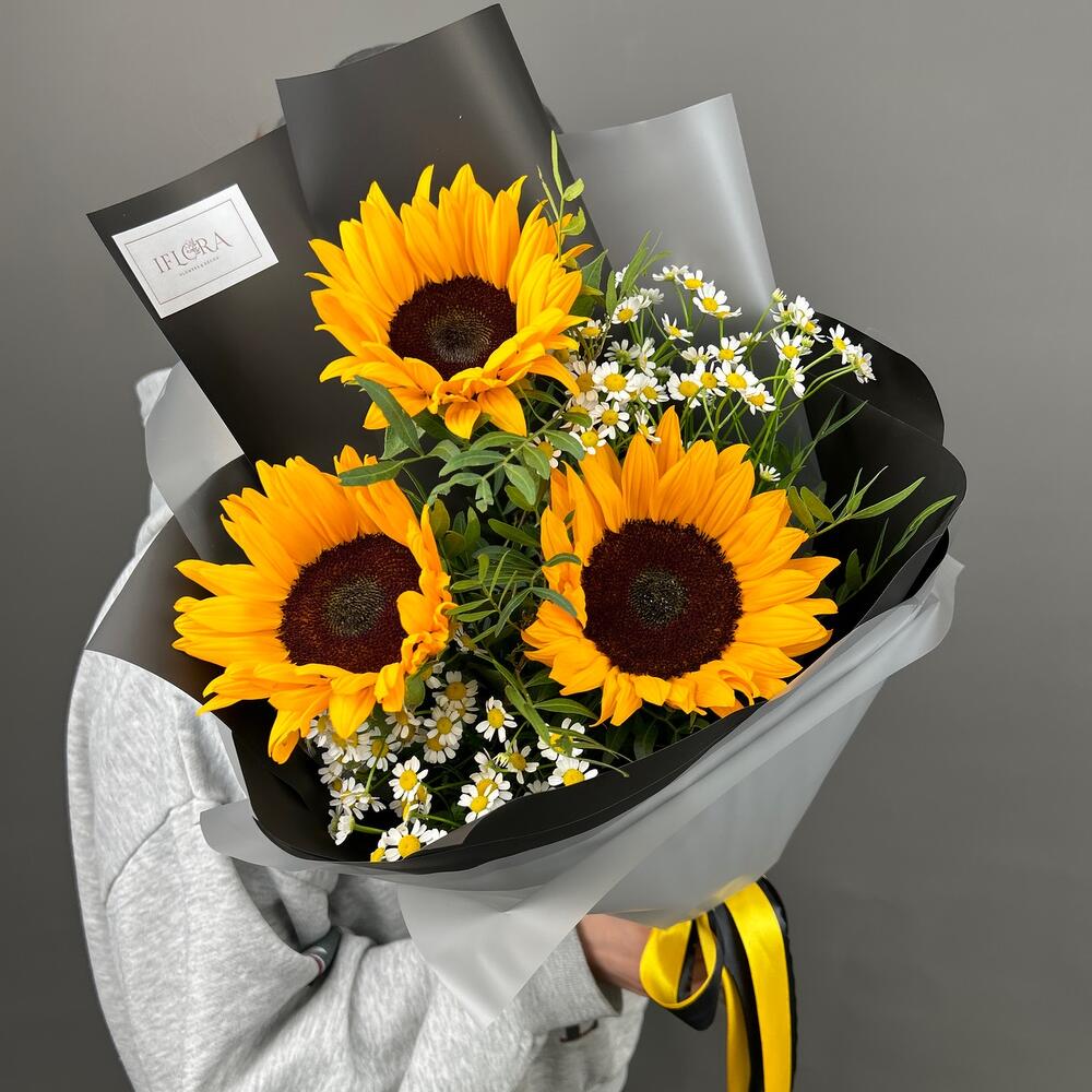 Танацетум – 2 шт.Лента атласная – 1 шт.Подсолнух – 3 шт.Фисташка – 2 шт.Пленка дизайнерская – 2 шт.
