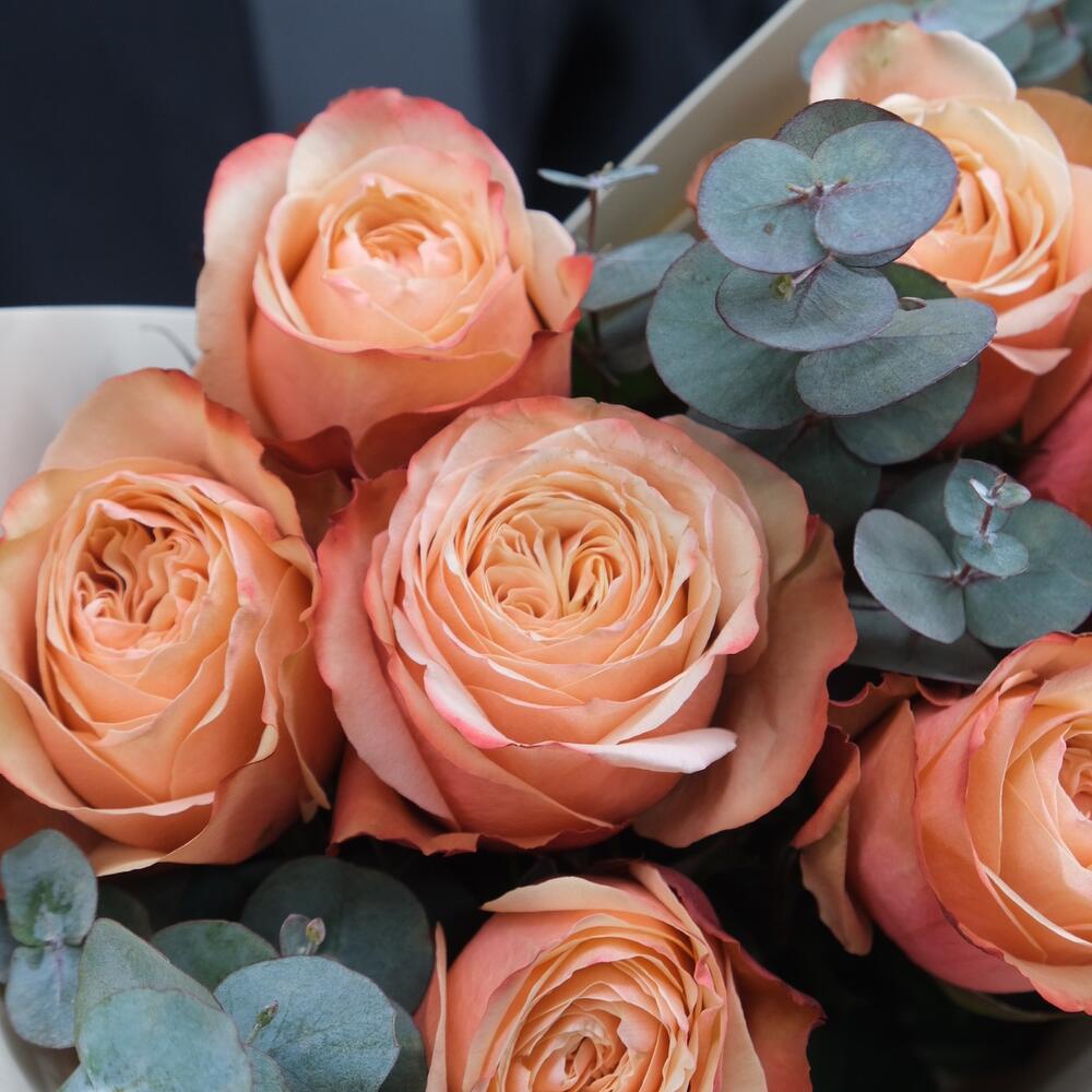 Эвкалипт – 3 шт.Роза пионовидная – 15 шт.Упаковка дизайнерская – 1 шт.Лента атласная – 1 шт.
