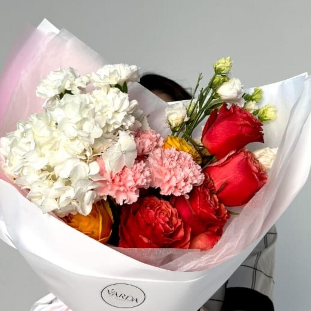 Гвоздики, Кустовые розы, Пионовидные розы, Розы