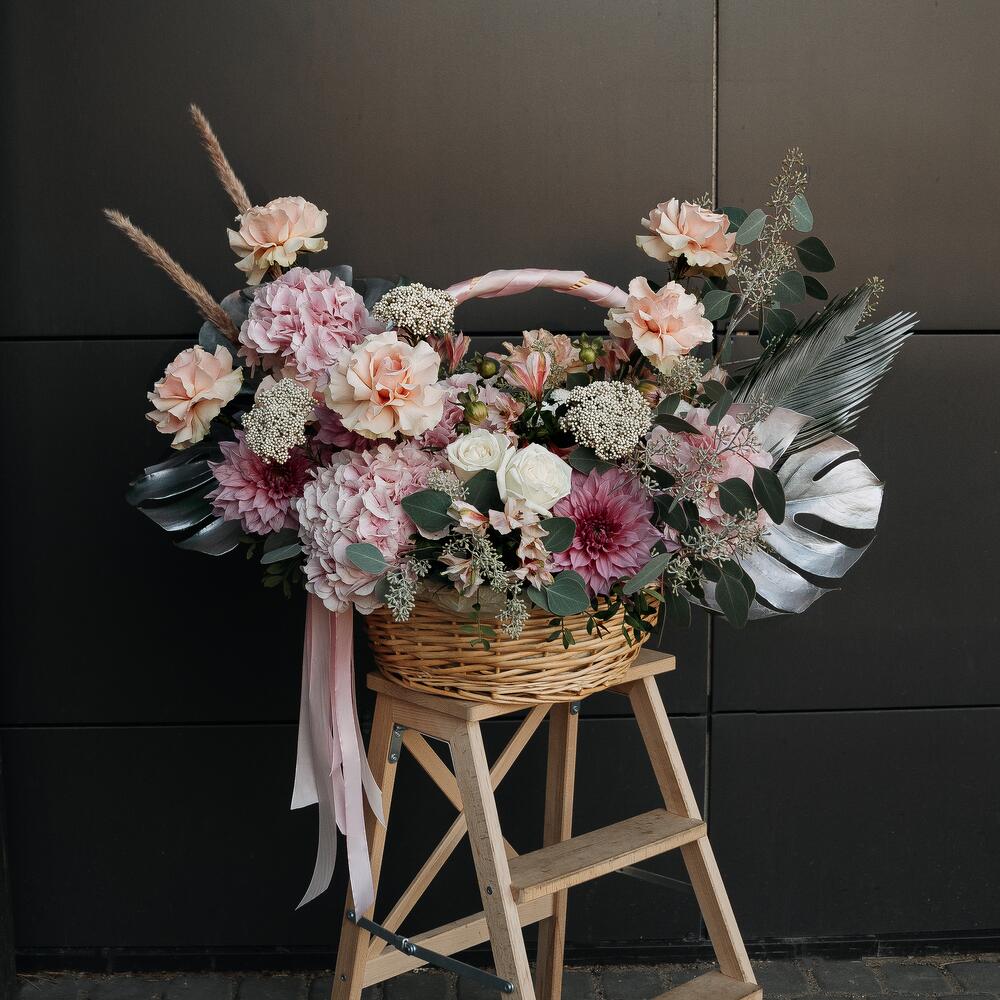 Гортензия – 2 шт.Роза Эквадор – 11 шт.Хризантема – 3 шт.Альстромерия – 9 шт.Озотамнус – 3 шт.Хризантема кустовая – 7 шт.пампасная трава – 7 шт.