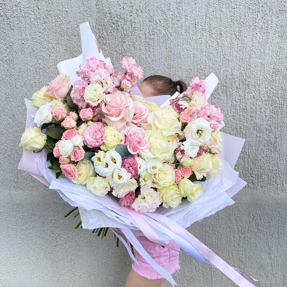 Представляем вашему вниманию уникальный авторский большой букет, созданный специально для ценителей красоты и элегантности. Этот букет включает в себя разнообразие прекрасных цветов, таких как розы и эустома, чтобы подарить вам незабываемые моменты и яркие эмоции.