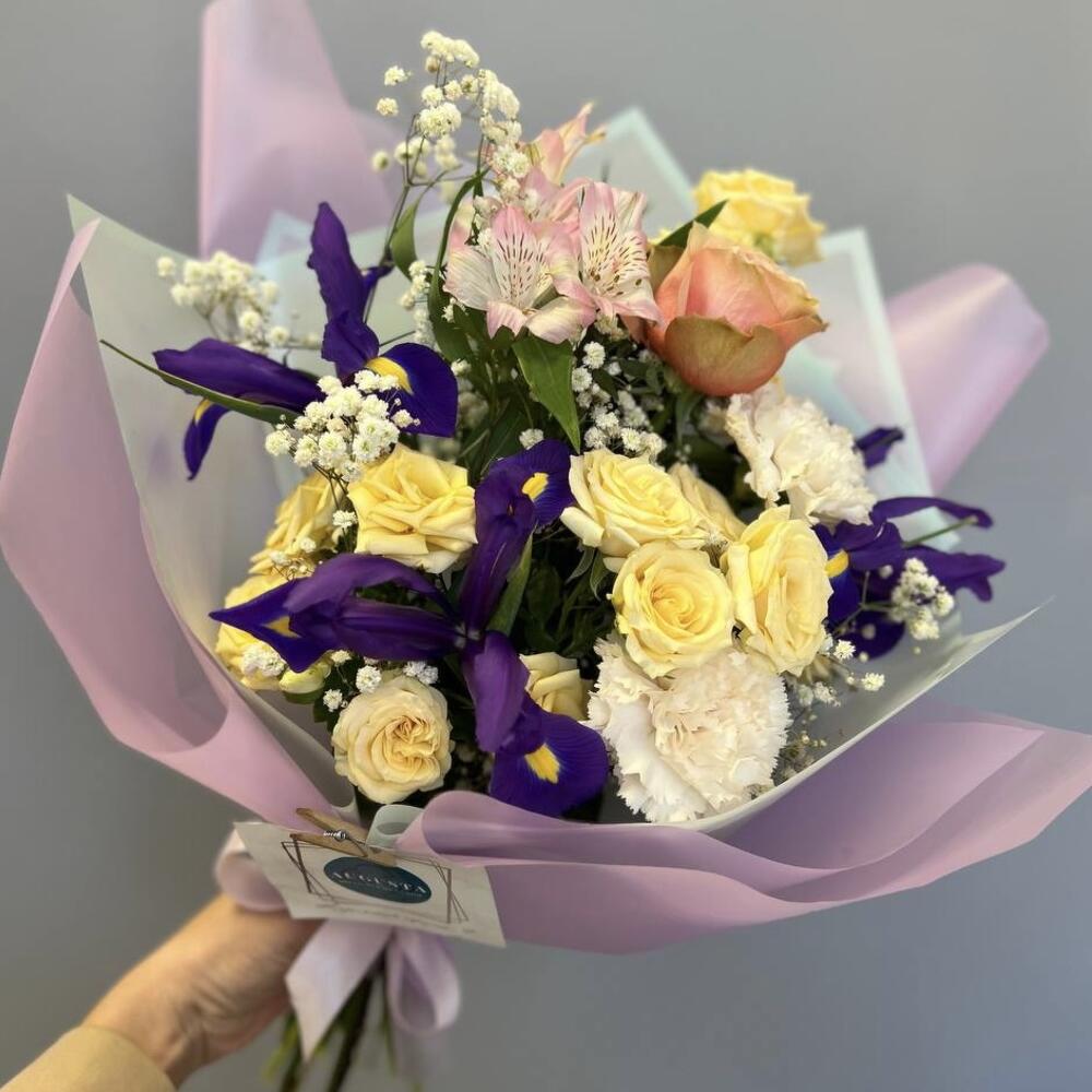 Ирис – 3 шт.Гипсофила – 1 шт.Роза кустовая – 3 шт.Роза Эквадор – 1 шт.Альстромерия – 1 шт.Диантус – 2 шт.