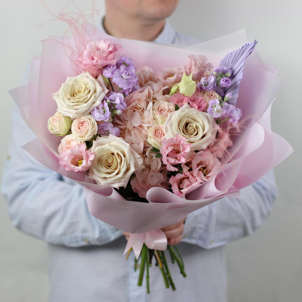 Гортензия – 1 шт.Маттиола – 3 шт.Писташ – 4 шт.Лента атласная – 1 шт.Роза кустовая пионовидная – 2 шт.Упаковка дизайнерская – 4 шт.эустома розовая – 3 шт.Стифа – 2 шт.Роза мента 50 см – 3 шт.пика пальма – 1 шт.