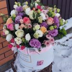 Роза кустовая – 5 шт. Хризантема кустовая – 5 шт. Эвкалипт – 5 шт. Эустома – 15 шт. розы разноцветные – 15 шт. коробка большая шляпная – 1 шт.