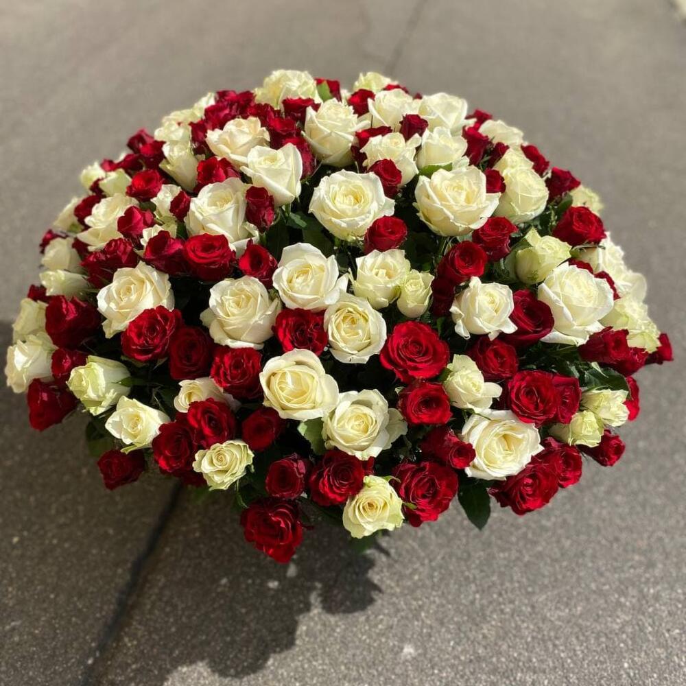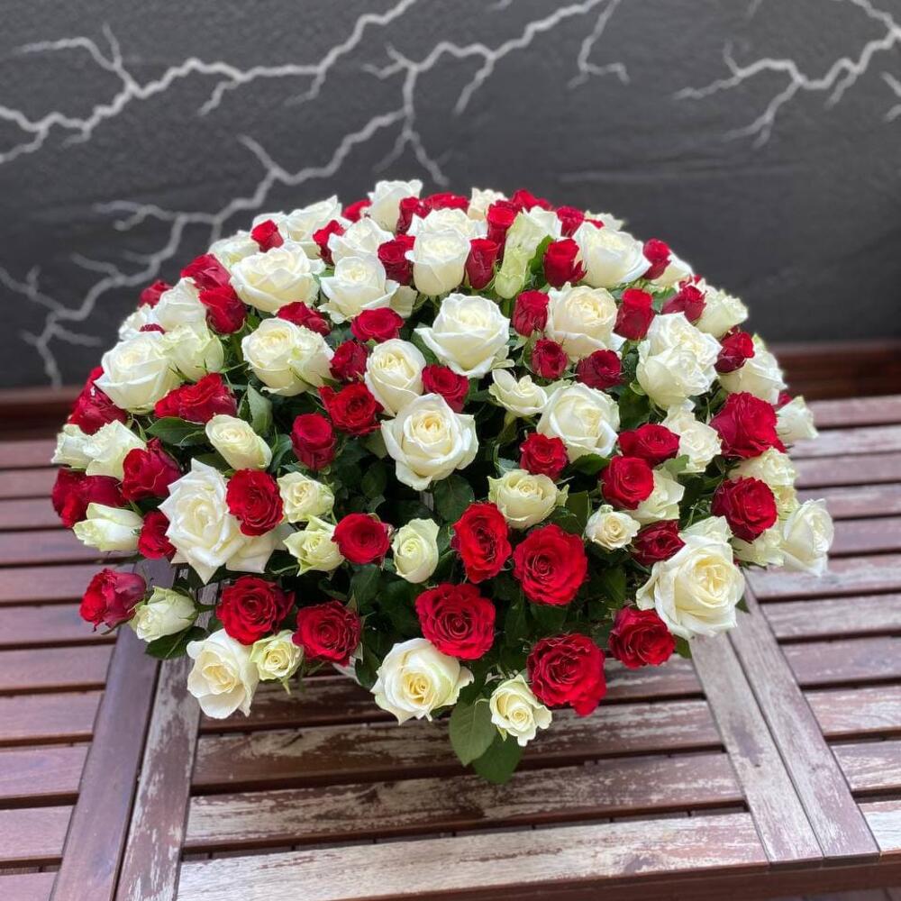 Большая корзина из 201 красной и белой розы “Красно-белая фреска”