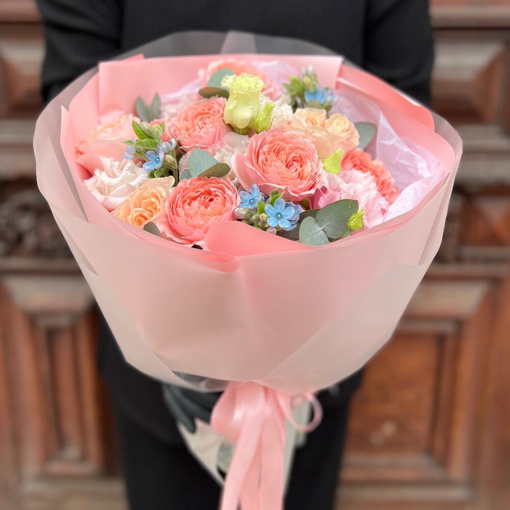 Роза пионовидная дэвида остина – 3 шт.роза пионовидная кустовая джульетта – 2 шт.эустома махровая розовая – 2 шт.Оксипеталум – 3 шт.Эвкалипт – 3 шт.Тишью – 1 шт.Пленка матовая – 7 шт.Лента атласная – 2 шт.
