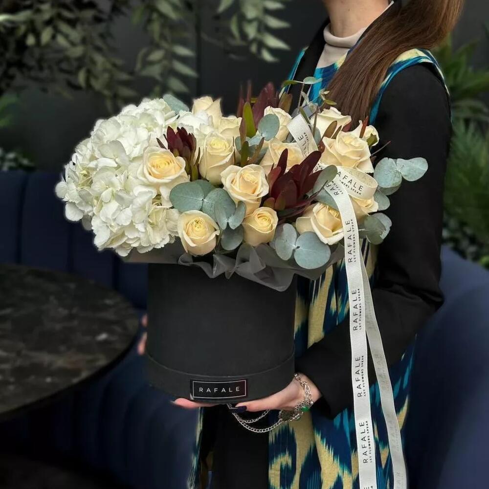 Букет "BOX 20.0" состоит из 15 голландских роз, 1 голландской гортензии, 1 ветки сафари и 2 веток эвкалипта в коробку. Эта композиция — идеальный способ рассказать о чувствах. Будь то начало отношений, важная для Вас обоих дата или просто знак внимания любимой. Выбрав букет от RAFALE, Вы скрасите день обладательницы букета и подарите ей незабываемые эмоции.