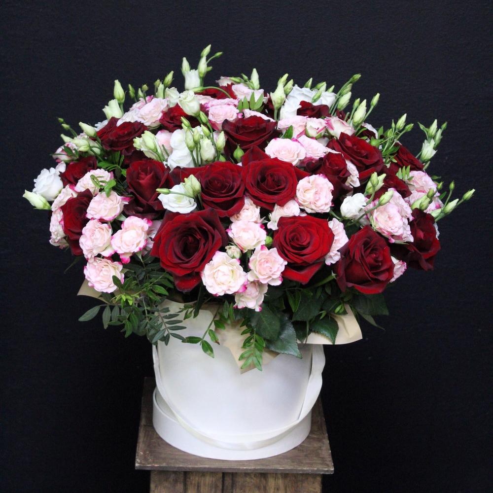 роза кустовая мадам бомбастик – 15 шт.Роза Эквадор – 35 шт.Лизиантус белый – 10 шт.Фисташка – 5 шт.Коробка шляпная – 1 шт.Оазис флористический – 2 шт.Атласная лента – 1 шт.