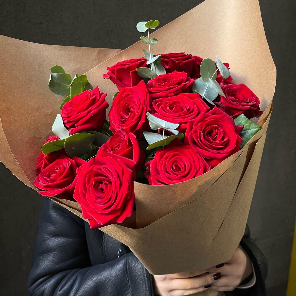 Букет 17: 9 красных роз с эвкалиптом
